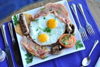 Eggs, Bacon, Tomato, Mushroom, Hash Brown & Sausage.